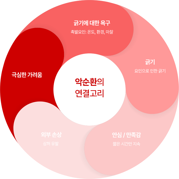 짧은 만족감, 피부 손상(상처), 극심한 가려움이 반복되는 악순환의 연결고리와 합병증을 주의하는 것이 중요합니다.